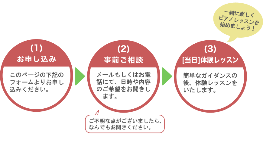 体験レッスンをうけてみませんか?やはり、実際に体感しないとピアノレッスンの楽しさは分かりません。生のピアノを奏でる楽しさをぜひご体感ください。